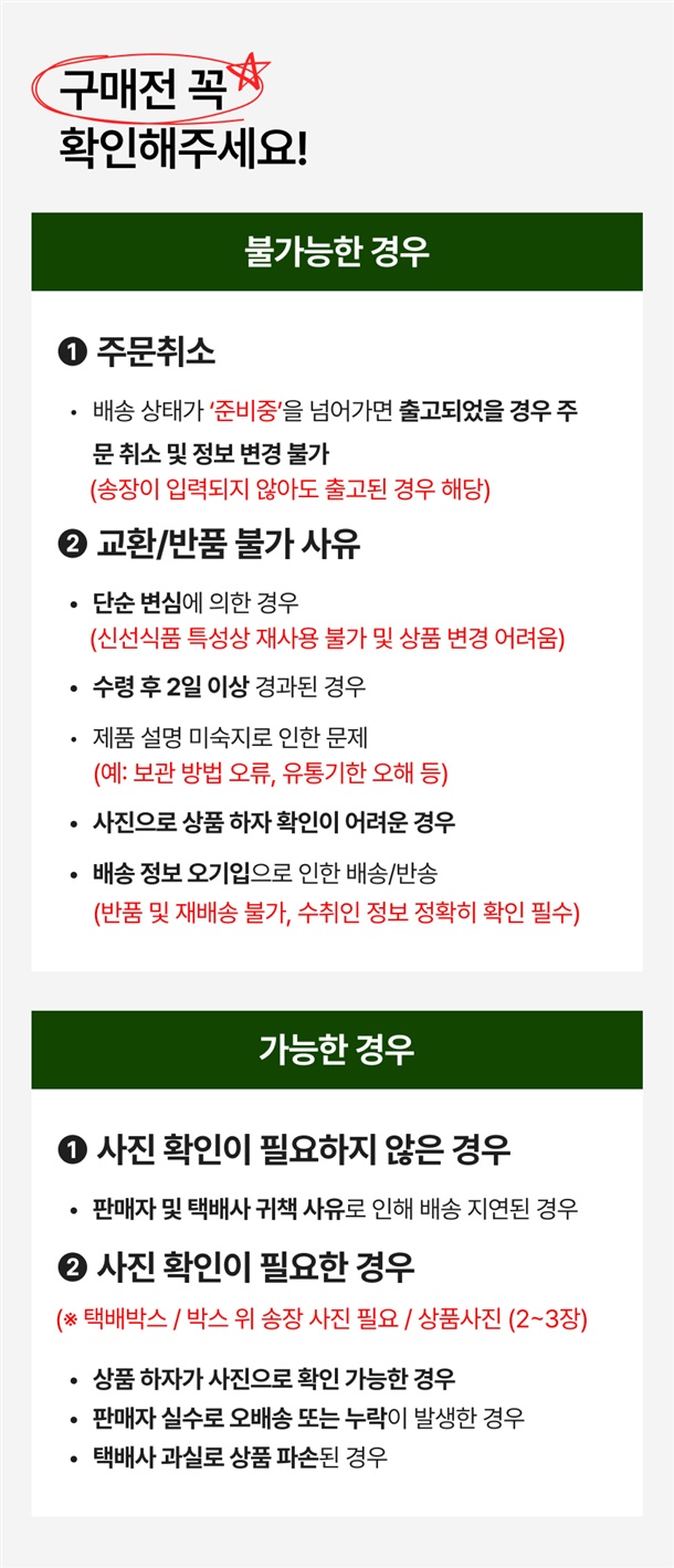 · 상품 불량 사유와 사진을 남겨 주시면 빠른 처리가 가능합니다.